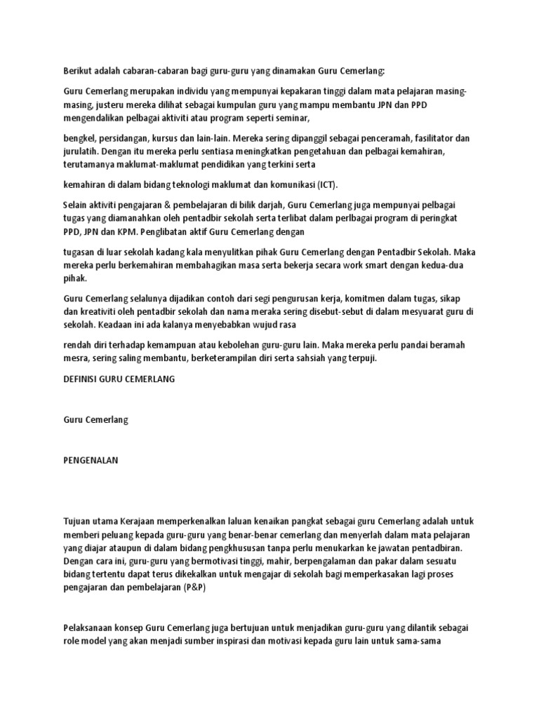 Sebagai seorang guru seseorang itu hendak sentiasa kreatif dalam cara penyampaian. PUNCA KUASA Pada tahun 1993 Mesyuarat Jemaah Menteri telah pun meluluskan memorandum bertajuk Sistem Kenaikan Pangkat Dalam Perkhidmatan Pendidikan. Hal ini Cabaran dan Permasalahan mungkin disebabkan oleh pengetua yang terperangkap dengan zon selesa yang merasakan Kejayaan sesebuah sekolah terletak pada bahawa sekolah mereka telah cukup cemerlang.