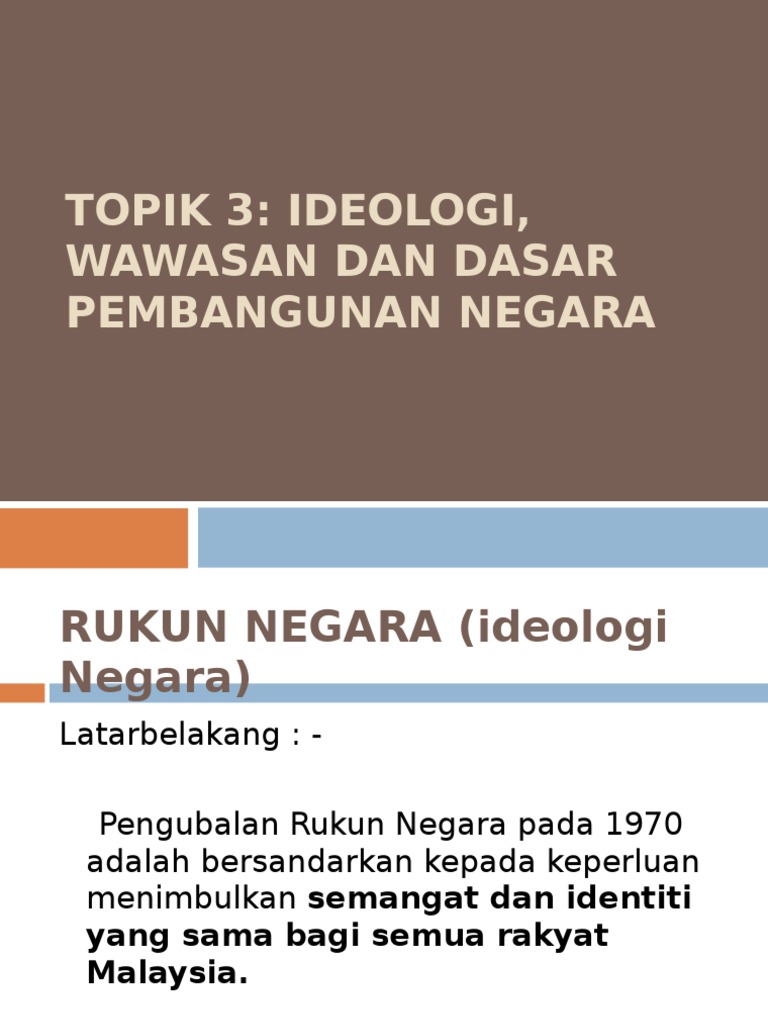 Pelajar perlu mengetahui Ideologi Negara Wawasan 2020 Dasar Pembangunan Negara merangkumi Dasar Ekonomi dan Dasar Sosial dan Budaya. -Mencapai perpaduan yang lebih erat di kalangan seluruh masyarakatnya. Ideologi Negara - RUKUN NEGARA.
