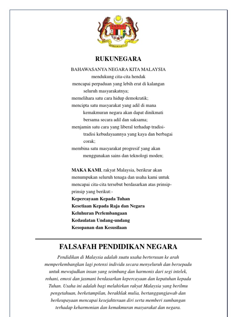 Berdasarkan kepada pertimbangan atas Laporan dan Akta Pendidikan Rukun Negara dan cirri-ciri ideologi serta kebudayaan masyarakat Malaysia maka Falsafah Pendidikan KebangsaanFPK telah digubal dan diumumkan secara rasminya pada tahun 1988. Pelajaran 1979 Perlembagaan dan Rukun Negara dan matlamat serta prinsip-prinsip. Journal of Business and Social Development Volume 52 2017.
