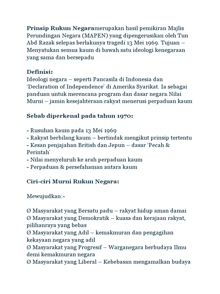 Prinsip-prinsip yang terkandung dalam Rukun Negara jelas merupakan kunci kepada keharmonian dan perpaduan kaum demi kejayaan dan kestabilan Malaysia. Ia adalah satu susunan cara ataupun prinsip hidup bermasyarakat yang mengandungi nilai-nilai kenegaraan dan norma-norma sosial yang meliputi semua aspek kehidupan bernegara. Ia adalah satu susunan cara ataupun prinsip hidup bermasyarakat yang mengandungi nilai-nilai kenegaraan dan norma-norma sosial yang meliputi semua aspek kehidupan bernegara.