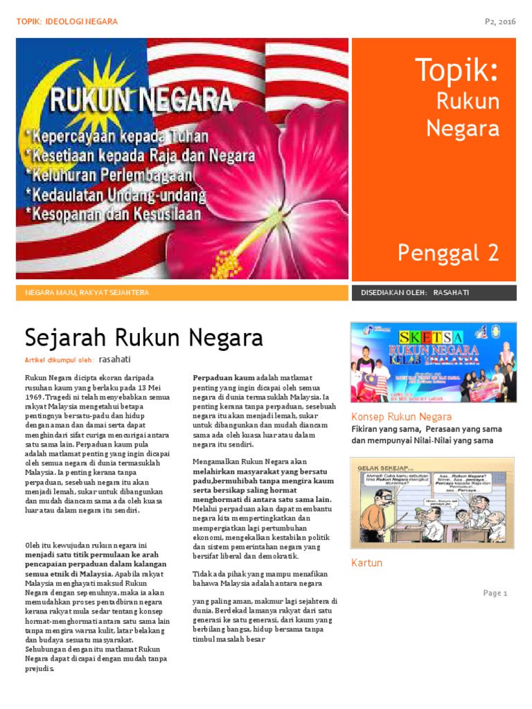 Nilai dan semangat yang terkandung dalam Rukun Negara dilihat semakin luntur apabila masyarakat tidak lagi melihatnya sebagai satu pendekatan ke arah pembentukan dan penyatuan negara bangsa. Pensyarah di Pusat Pengajian Sains Kemasyarakatan Universiti Sains Malaysia Profesor Madya Dr Sivamurugan Pandian berkata kelima-lima prinsip yang. Memperkenalkan Rukun Negara kepada masyarakat supaya mereka dapat mengetahui dan memahami falsafah serta prinsip-prinsip Rukun Negara.