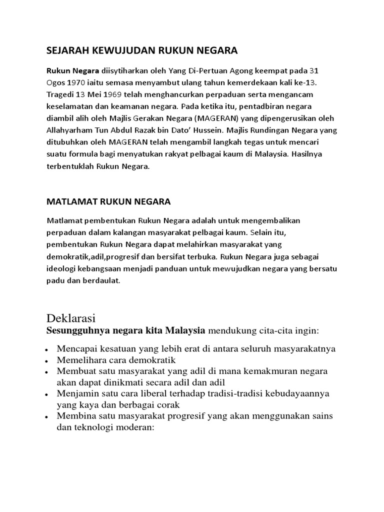 Share Nota Sejarah T6-Rukun Negara 2 everywhere for free. Kunci utama penggubalan Rukun Negara hasil perundingan Majlis Gerakan Negara MAGERAN yang ditubuhkan selepas tercetusnya peristiwa 13 Mei 1969 adalah untuk memperkukuh dan mengembalikan perpaduan kaum bagi kehidupan bernegara yang aman dan harmoni. Ideologi ini tercetus dalam mesyuarat pertama MPN pada 27 Januari 1970 dan diisytihar secara rasmi oleh YDPA pada 31 Ogos 1970 ketika sambutan Hari Kemerdekaan Malaysia.